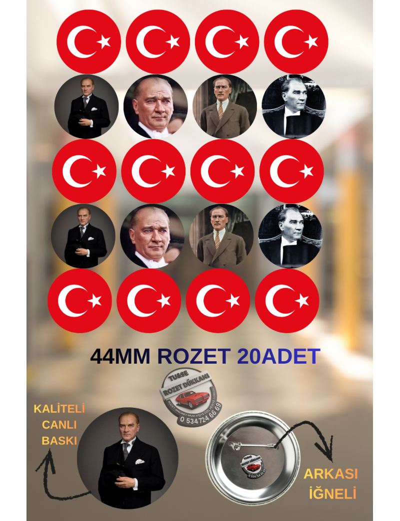 44mm boyutundaki Atatürk ve Türk Bayrağı temalı rozet seti, milli günlerde, etkinliklerde, okullarda ve resmi törenlerde kullanıma uygundur.