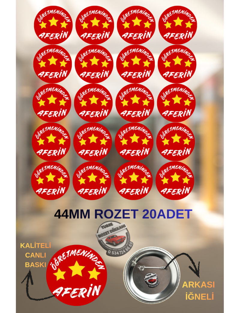 Her biri 44mm boyutunda, kaliteli baskıya sahip ve sağlam iğneli metal arka yüzle üretilmiştir.