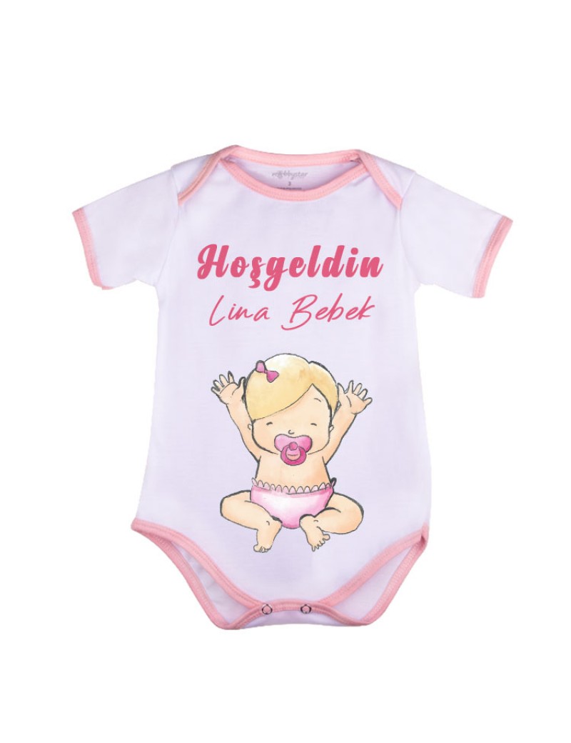 6–12 ay bebekler için tasarlanan bu kısa kollu pembe zıbın, yumuşacık pamuklu dokusuyla konfor sağlar, kişiye özel baskı seçeneğiyle bebeğinizin tarzını yansıtır.