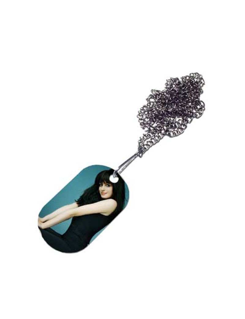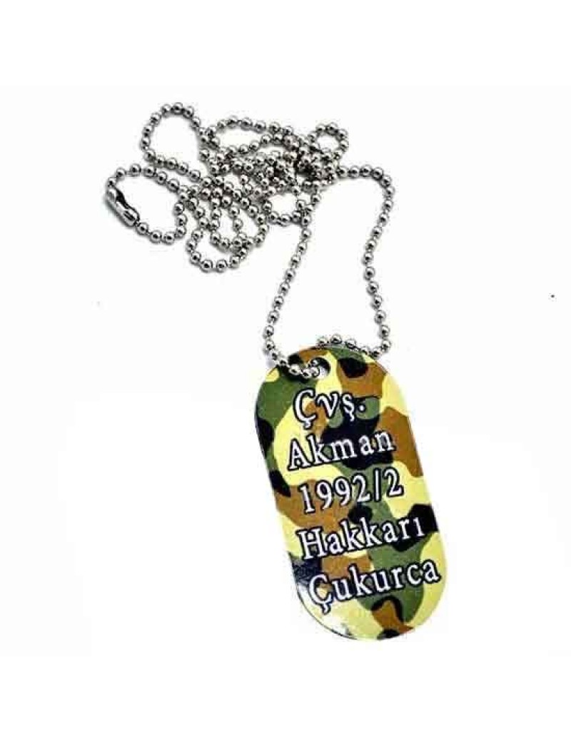 Bu çift taraflı asker künyesi, metal plaka ve zincir olmak üzere iki parçadan oluşur.