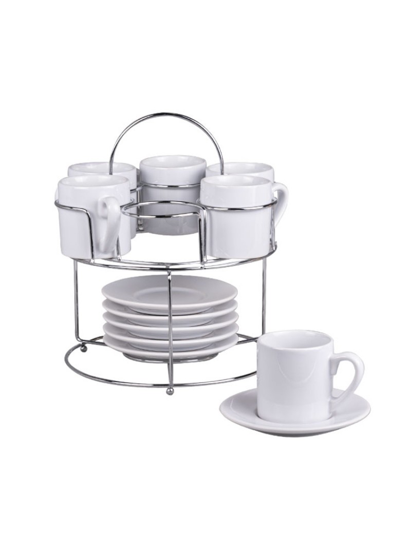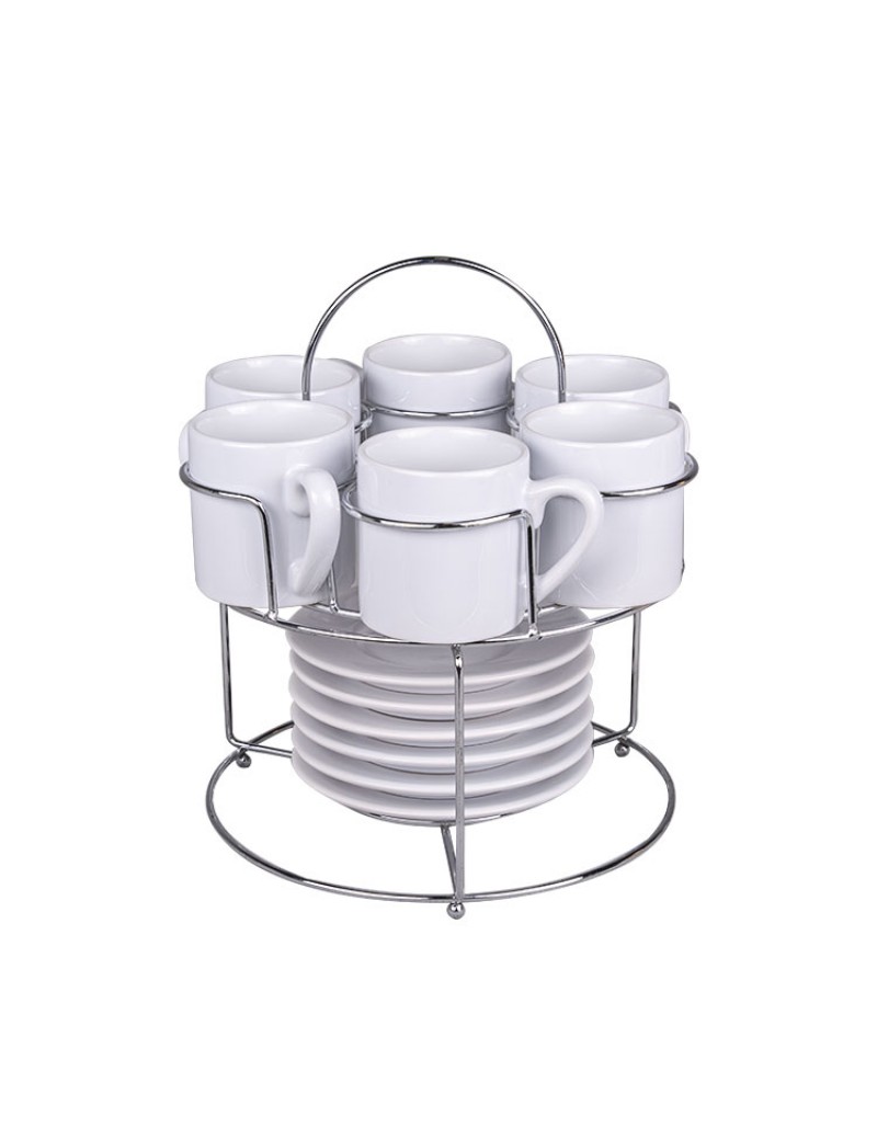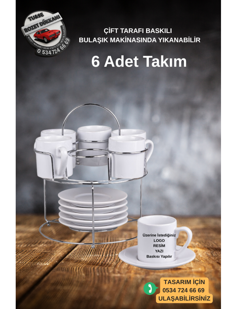 Şıklığı ve fonksiyonelliği bir arada sunan Papatya Standlı Türk Kahve Fincan Takımı, 6 parçadan oluşan beyaz porselen fincan ve papatya desenli salkım standıyla gelir. Üzerine resim, yazı veya logo baskısı yaparak tamamen kişiye özel hale getirebilirsiniz.