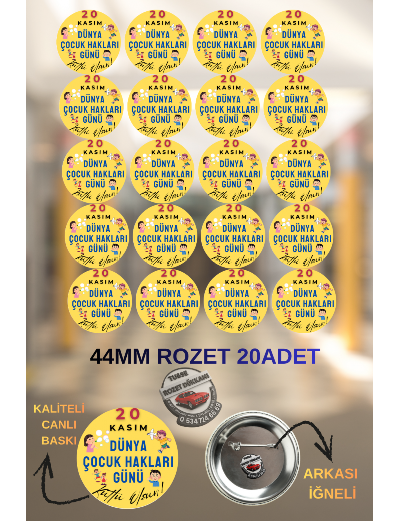 20 Kasım Dünya Çocuk Hakları Günü için özel olarak tasarlanan bu 44mm buton rozetler, farkındalık etkinlikleri, okul kutlamaları ve sosyal projelerde kullanılmak üzere idealdir.