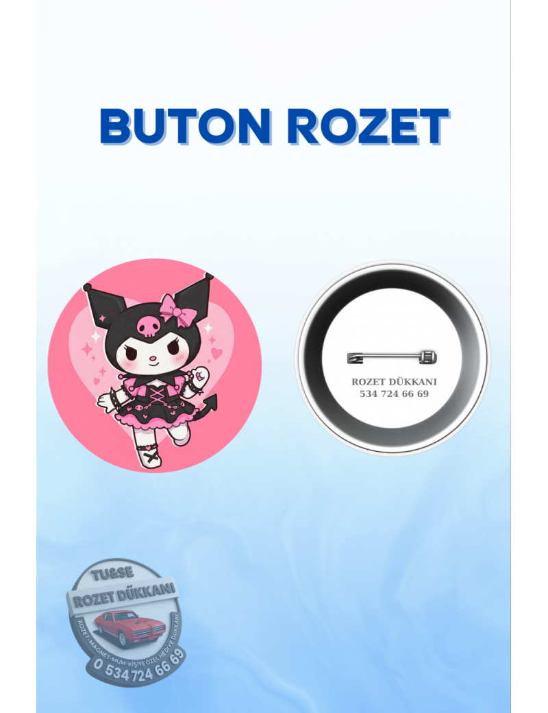 Kuromi temalı sevimli rozet, anime ve kawaii tarzını sevenler için özel olarak tasarlanmıştır. Çanta, mont, ceket, kalemlik ve pano gibi alanlarda rahatlıkla kullanılabilir. Günlük kombinlere eğlenceli bir dokunuş katarken koleksiyonluk ve hediye alternatifi olarak da tercih edilir.