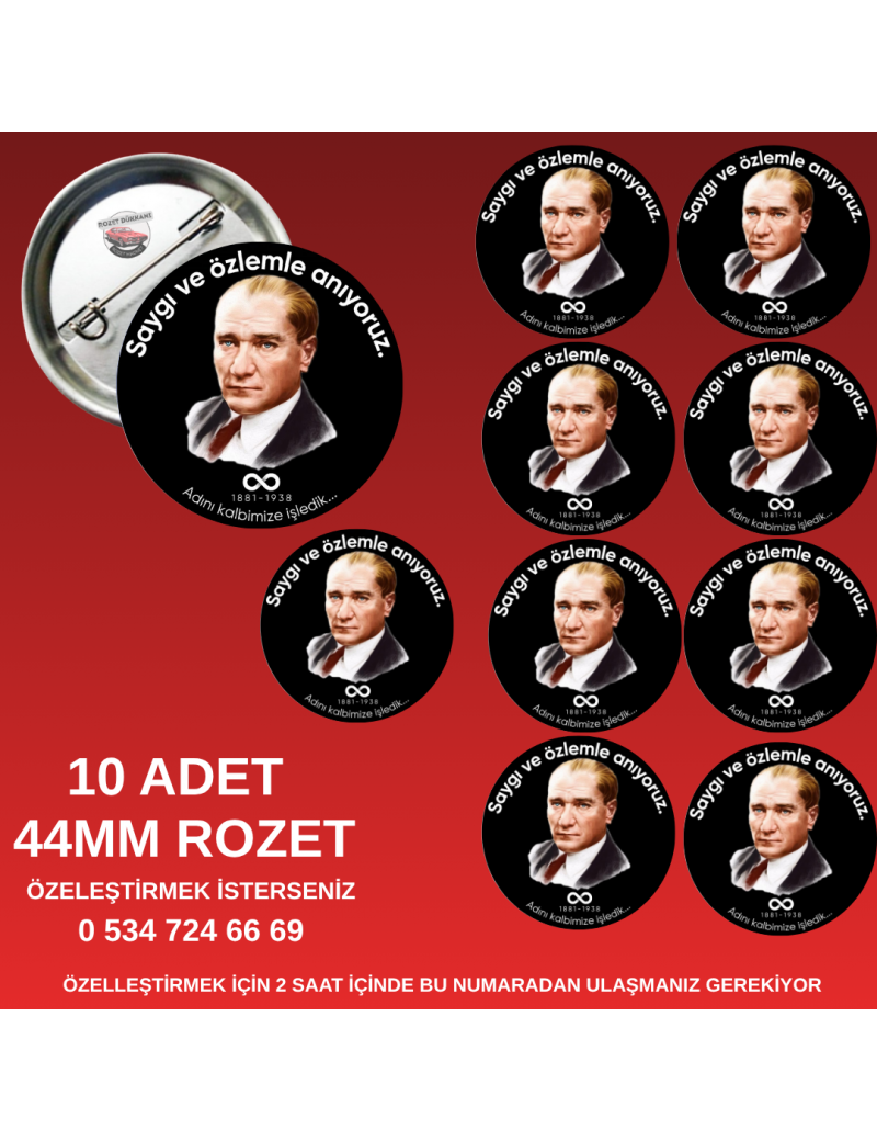 10 Kasım Atatürk Anma Rozeti Seti, özel olarak hazırlanmış 10 adet 44mm yaka rozetinden oluşur.