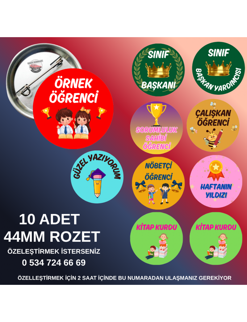 Her pakette 10 adet 44mm ölçüsünde okul rozeti bulunur.